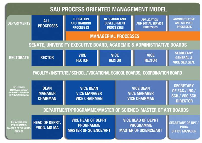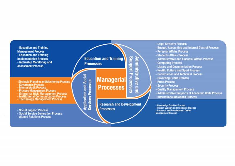 SAU started process management studies in parallel with strategic management as part of Total Quality Management works in 2003. For that purpose, all processes are gathered under 5 main processes;
